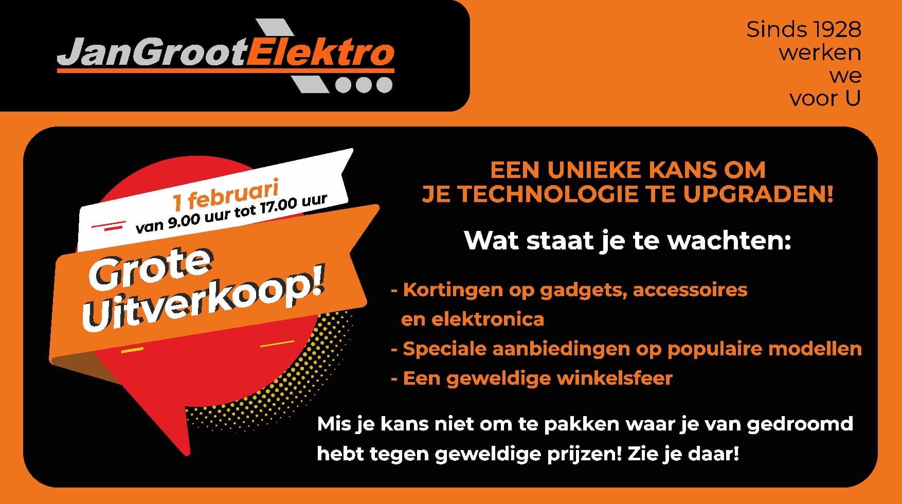 Geachte klanten, zoals jullie gehoord hebben stopt Jan Groot Elektro en gaan we door bij collega EP Beerepoot aan de nieuwstraat. De winkel en de reparatie dienst zijn helaas gesloten. Wilt u een apparaat gerepareerd hebben bel dan 0229-502420 en vermeld dat u klant van Jan Groot Elektro bent.